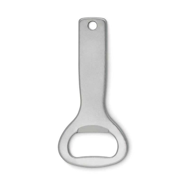 Apribottiglie in alluminio con portachiavi e finitura lucida.