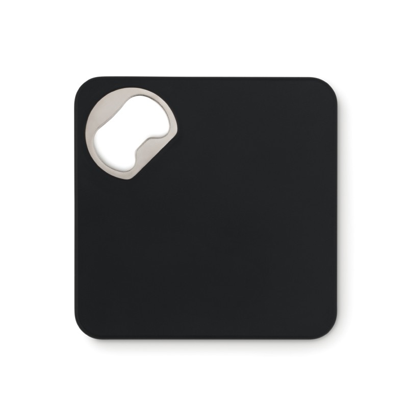 Apribottiglie quadrato con funzionalità di sottobicchiere.