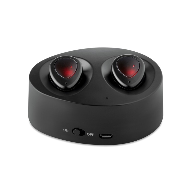 Set 2 auricolari bluetooth in scatolina con funzione di base di ricarica da 430mAh. Cavo di ricarica Micro USB incluso. Sistema magnetico anti spostamento.