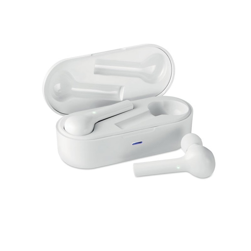 Set di 2 auricolai Wireless Stereo (TWS) bluetooth 5.0 con batteria Li-ion da 35 mAh. Tempo di autonomia circa 2 ore. Include cavo micro USB di ricarica e base di carica da 300 mAh.