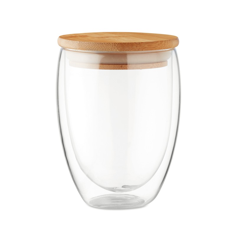 Bicchieri in doppio vetro con tappo in bamboo con anello in silicone. Capacità 350ml