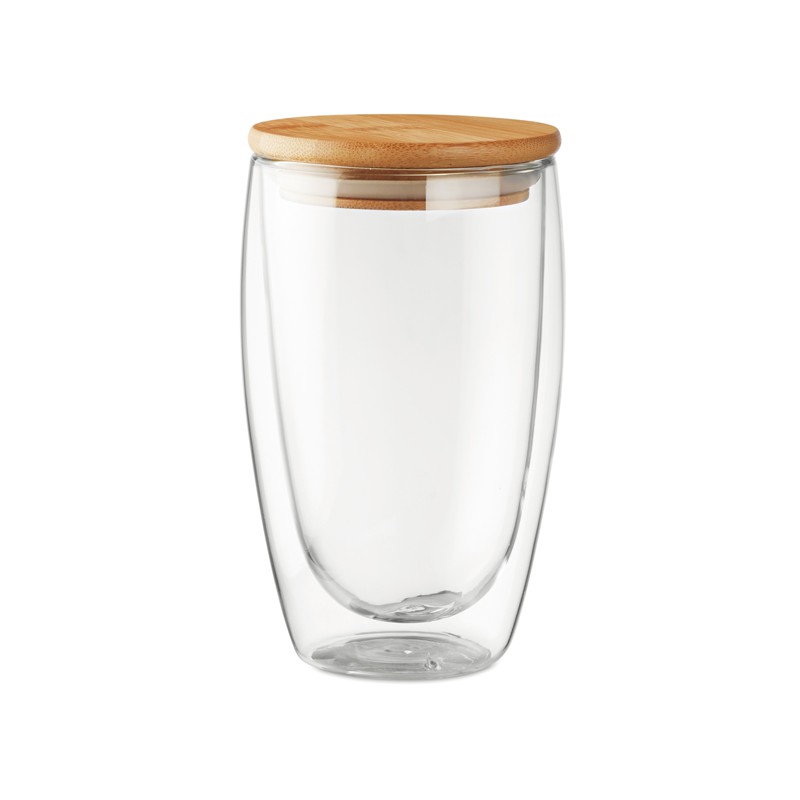 Bicchieri in doppio vetro con tappo in bamboo con anello in silicone. Capacità 450ml