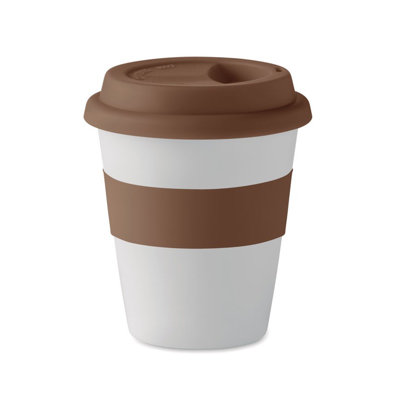 Bicchieri singolo strato in PLA 100% mais, con tappo e impugnatura in silicone. Il PLA è costituito da piante fermentate quindi privo di elementi tossici e carboni. Dimensioni ø9x11 cm