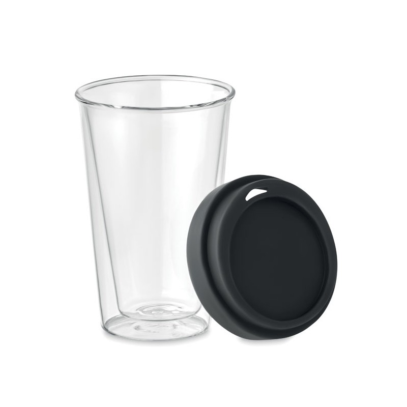 Bicchieri personalizzati in vetro doppio strato borosilicato, con coperchio in silicone. Capacità 350ml.