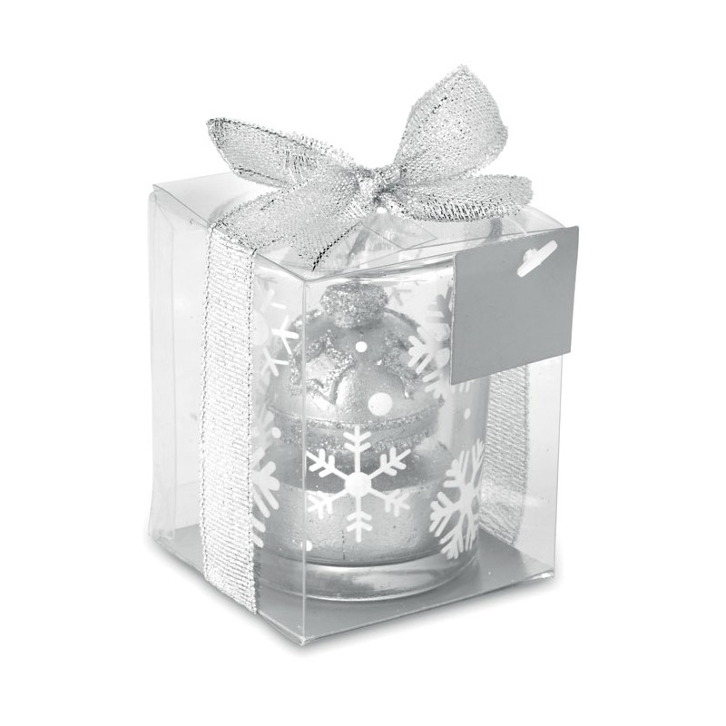 Portacandele in vetro trasparente con decorazioni a fiocco di neve glitterate. Confezionati in scatola di PVC con nastro in colore abbinato. Includono tealight.