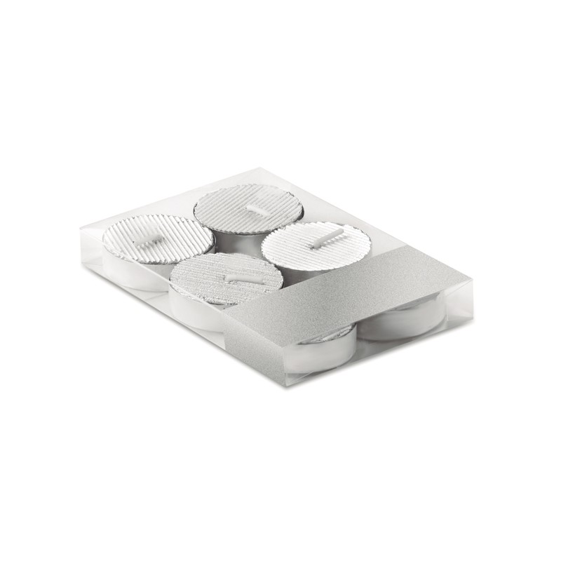 Set di 6 candeline natalizie colore silver. Confezionate in scatola trasparente con etichetta da stampare.