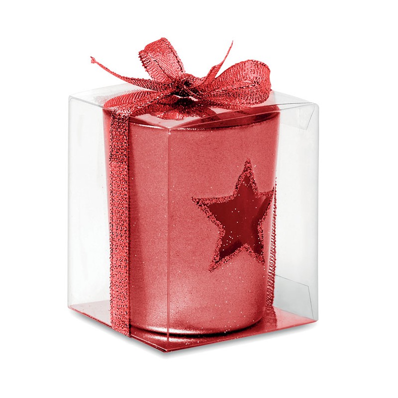 Portacandele in vetro con stella forata e glitter con tealight inclusa. Confezionata in scatola trasparente con nastrino in tinta.