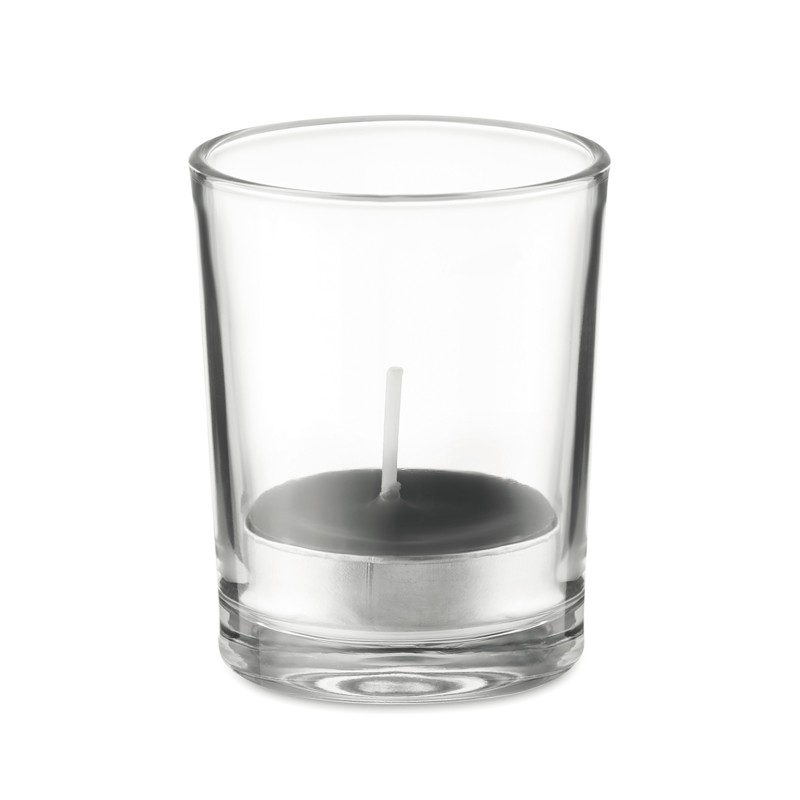 Candele colorate e profumate con bicchierino in vetro trasparente