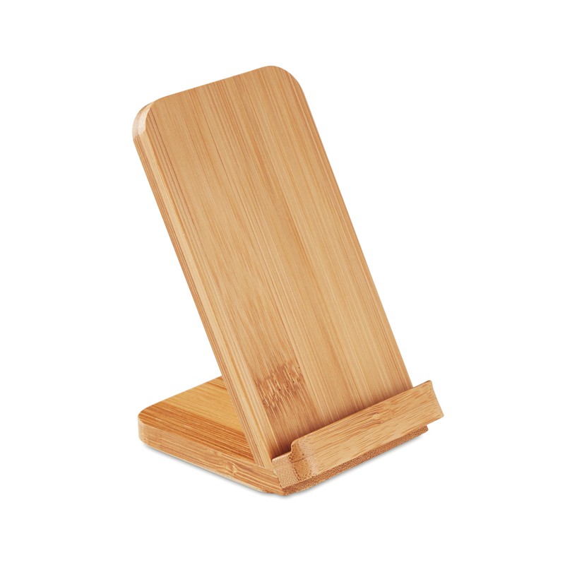 Caricabatterie wireless a doppia bobina per 1 dispositivo, con funzionalità di supporto. In Bamboo. Posizionare lo smartphone sul caricatore per avviare la ricarica. Output: DC5V / 1.0A. Compatibili con gli ultimi Androids, iPhone® 8, X e successivi. Trattandosi di bamboo naturale possono verificarsi variazioni di colore tra i vari articoli.