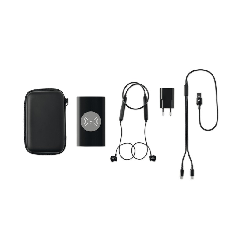 Caricabatterie senza fili in 4000 mAh con cavo integrato 2 in 1, adattatore USB con spina EU e auricolare Bluetooth 5.0 con chiusura magnetica. Output caricatore DC5V / 2A. Output wireless: DC5V / 1A. Caricabatterie wireless compatibile con gli ultimi Androids, iPhone® 8, X e successivi. Presentati in custodia in EVA.