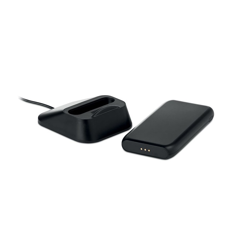 Caricabatterie wireless e powerbank da 10.000 mAh, in ABS. Include base di ricarica utilizzabile anche come appoggio. Output doppio USB-A DC5V/2A per carica veloce.