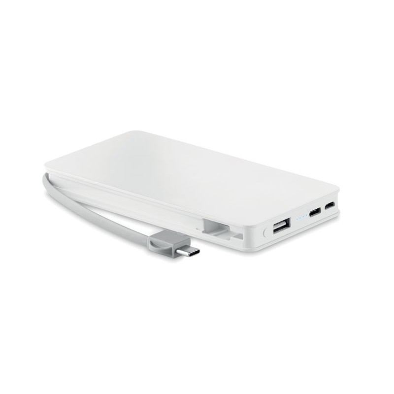 Caricabatterie da 5000mAh e caricatore wireless in ABS. Cavo integrato in TPE con output micro-B (2in1) e tipoC. 2 USB-A output DC5V/2.4. Compatibile con iPhone® 8, 8S e X e successivi.