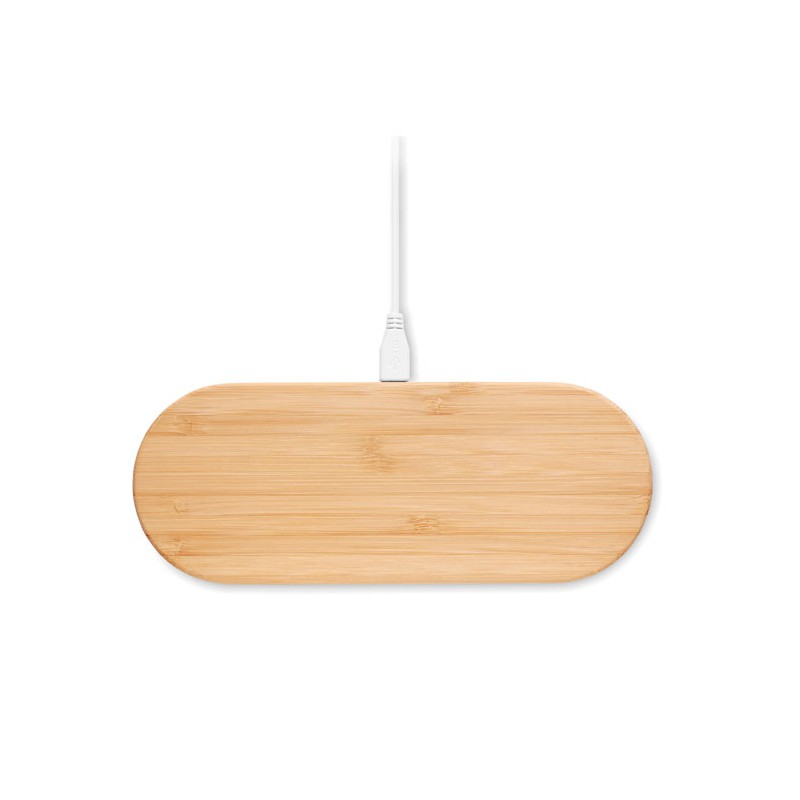 Caricabatterie wireless personalizzati a doppia bobina in bamboo, per 2 dispositivi. Uscita: DC5V / 1.0A x 2. Compatibili con gli utlimi Androids, iPhone® 8, X e successivi.