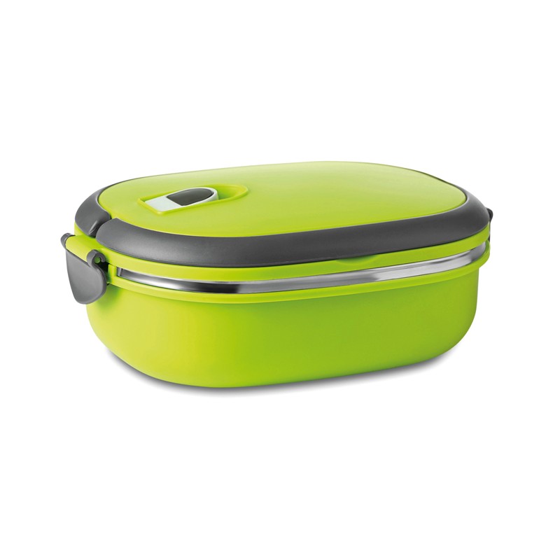 Porta pranzo con presa d'aria, esterno in PP e interno in acciaio inossidabile. Chiusura ermetica e manici richiudibili. Non indicato per microonde.