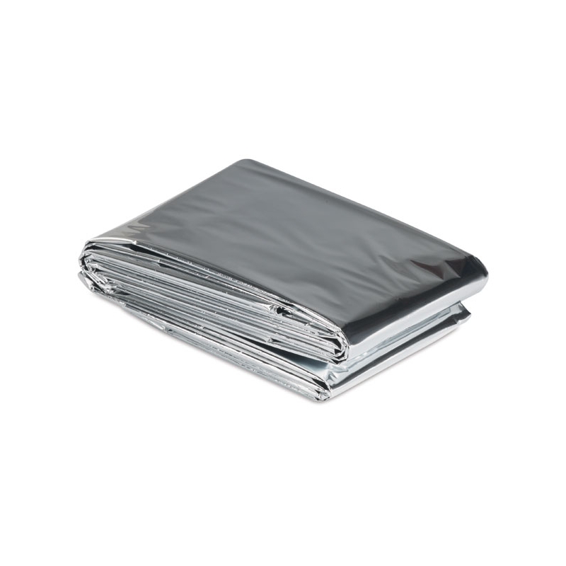 Coperta di emergenza ìn PET colore argento lucido. Aiuta a mantenere il calore del corpo