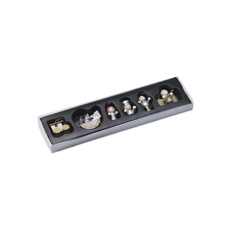Set di 6 decorazioni natalizie in legno dipinte in argento e oro in confezione di cartone argento con coperchio trasparente.