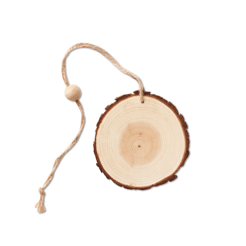 Decorazioni natalizie tonde in legno e corteccia, con cordino per appendere.