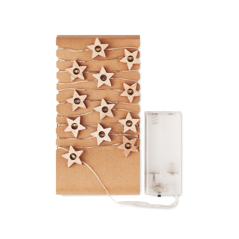 Stringa con 20 LED con decorazioni a forma di stella in legno. Confezionate in scatola di cartone. 2 batterie AA esclusi.