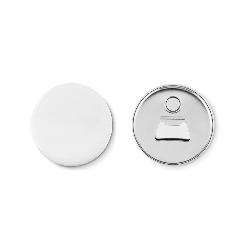 Spilla a bottone magnetica con apribottiglie. Interno in carta.