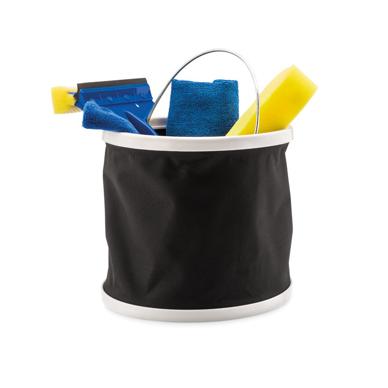 Set di strumenti per la pulizia dell'auto in custodia con 1 spazzola, 1 guanto in microfibra, 1 spugna, 1 panno in microfibra, 1 secchio pieghevole.
