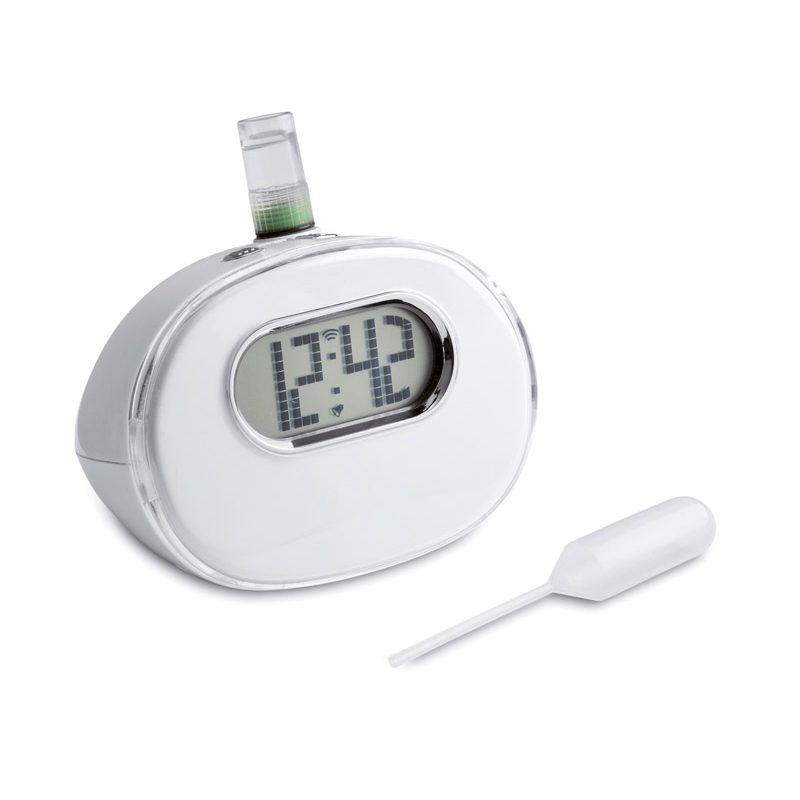 Orologio da tavolo con display LCD alimentato da acqua o da qualsiasi altro liquido. In ABS