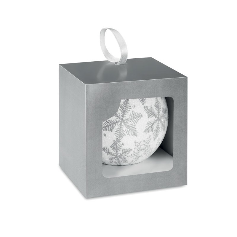 Pallina di Natale con decorazione fiocchi di neve, nastrino in raso e scatola con finestra.