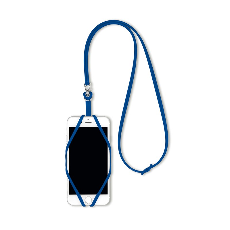 Porta smartphone da collo in silicone, con elastici sul fronte e portabiglietti da visita sul retro.