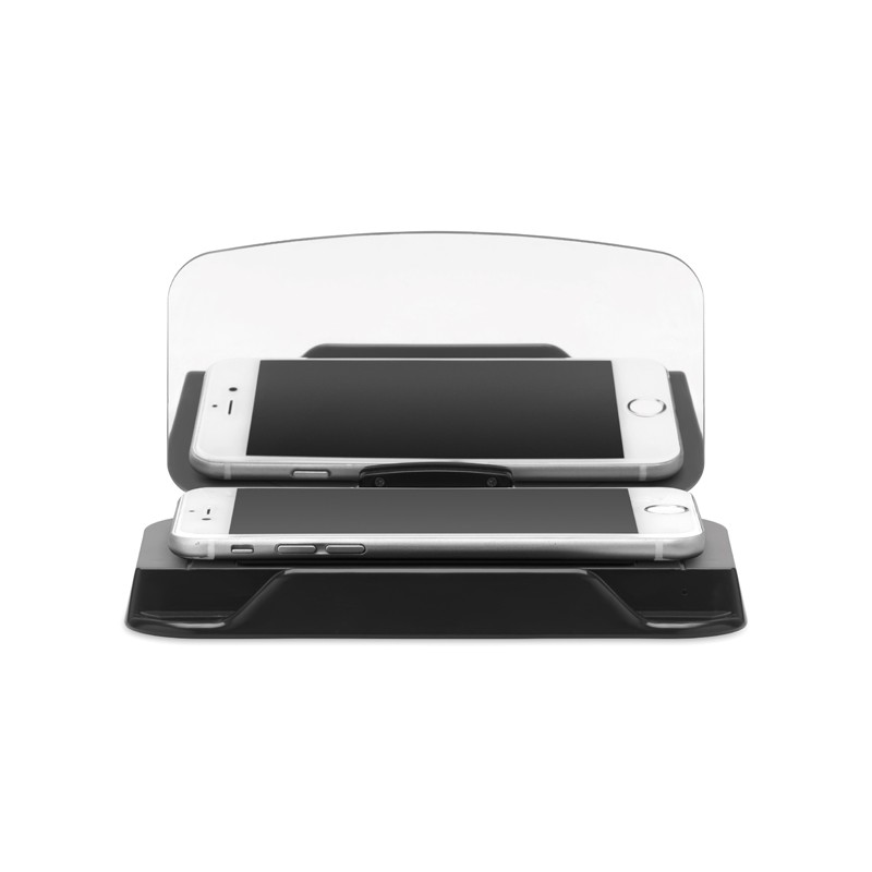 Portacellulari con display di navigazione con sistema HUD. Caricabatterie wireless con antiscivolo sul fondo. Output: DC5V / 1.0A. Funziona con qualsiasi app HUD.