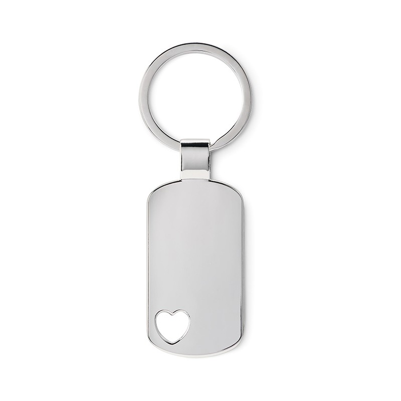 Portachiavi in metallo con dettaglio a forma di cuore posto nell'angolo in basso. Confezionato in scatolina nera.