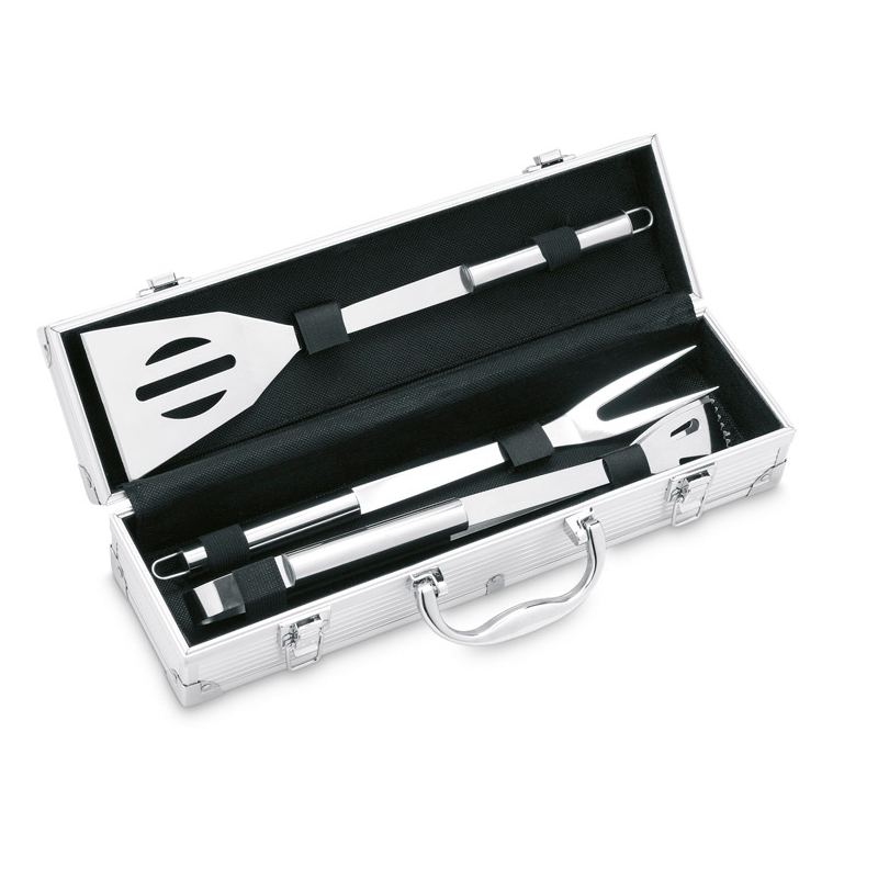 Set 3 utensili in acciaio inossidabile per BBQ in valigetta di alluminio. Placca per logo aziendale