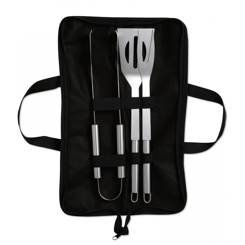 Set di tre accessori in acciaio: spatola, pinza e forchettone. Confezione in TNT nera con chiusura zip