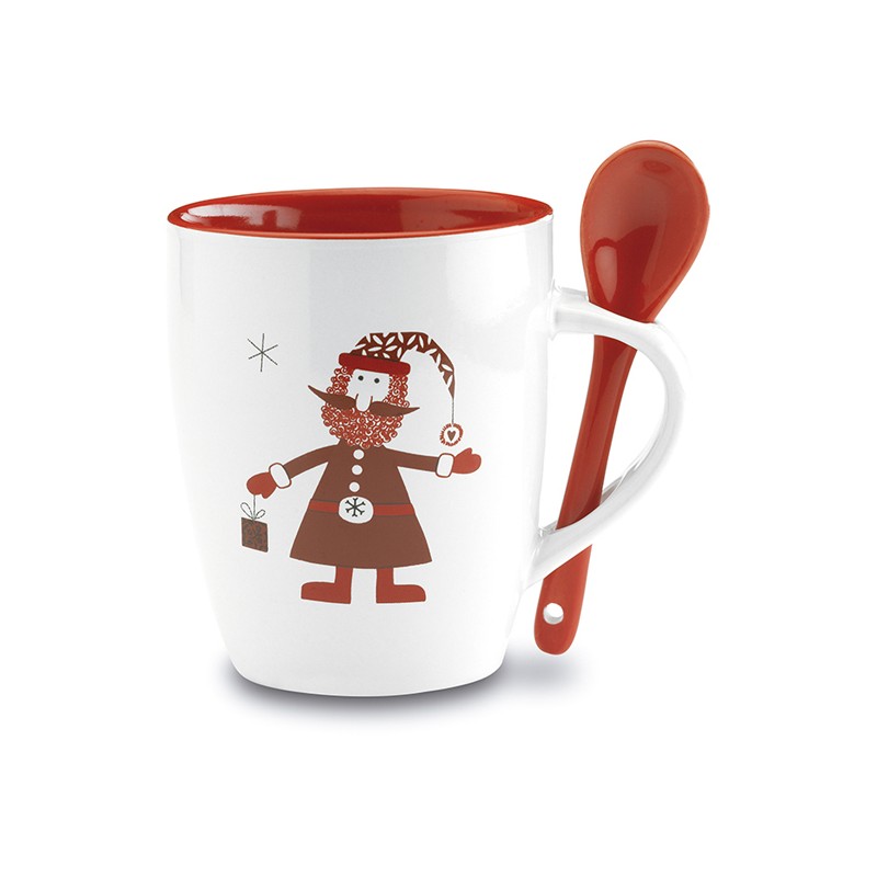 Tazze in ceramica con cucchiaino. Decorazioni con Babbo Natale su tazze e scatole regalo