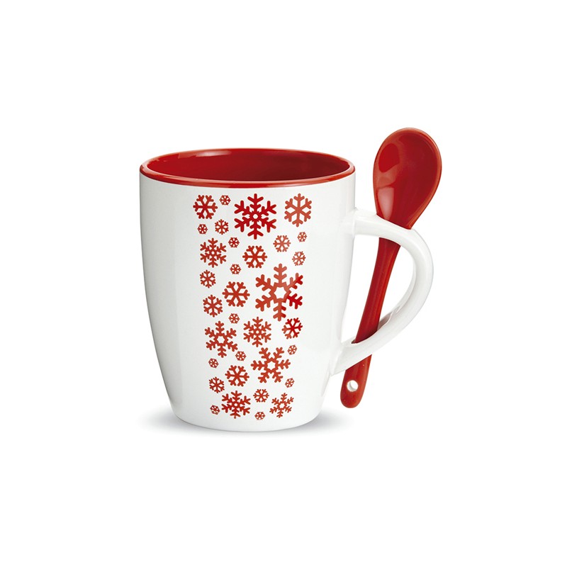 Tazze di ceramica con cucchiaio integrato e decorazione con fiocchi di neve. Confezionate in scatole di cartone con disegno abbinato