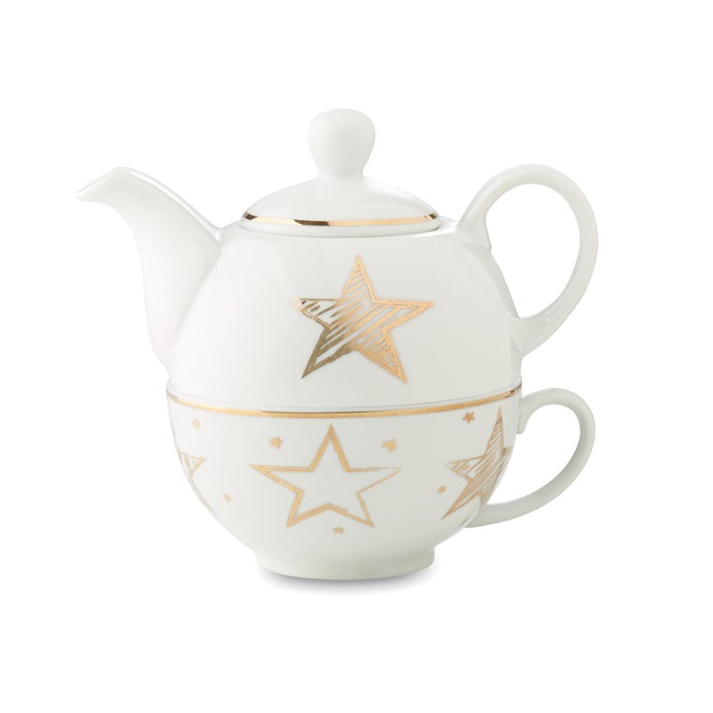 Set teiera (400ml) e tazza (260ml) sovrappolibili, in ceramica bianca con disegni di stelle. Confezionato in scatola regalo nera.