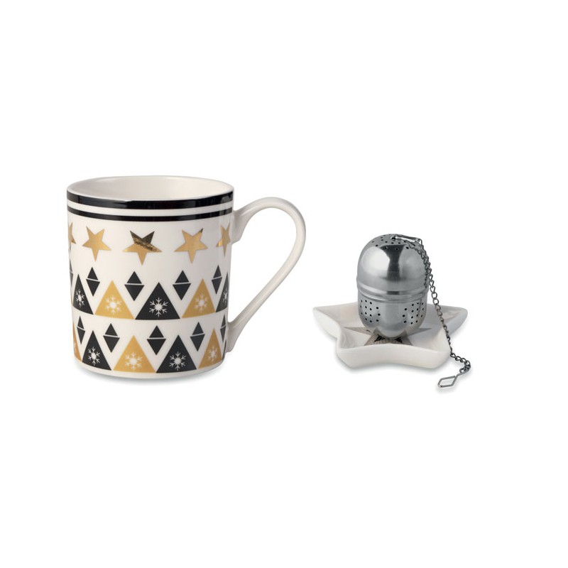 Tazza con decorazioni natalizie e infusore con piattino a forma di stella. Presentato in scatola di cartone con finestra in PVC trasparente e cordino.