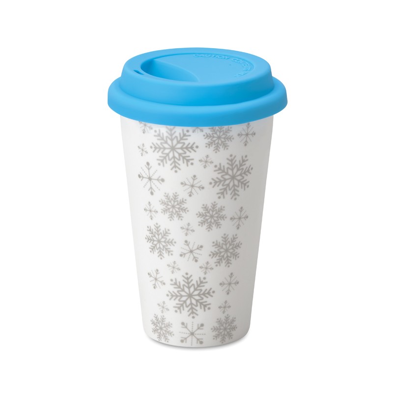 Tazza da viaggio da 275 ml in ceramica con doppio rivestimento. Motivi natalizi e tappo in silicone.