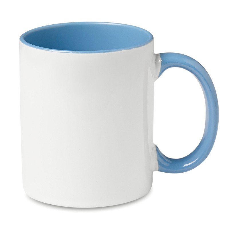 Tazza in ceramica (240 ml) con finitura speciale per stampa in sublimazione con manico ed interno colorati.