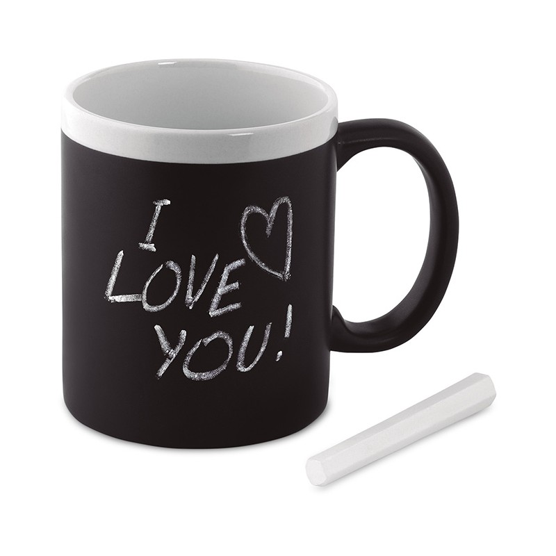 Tazze rivestite di un particolare materiale che ricrea la superficie di una lavagna sulla quale si può scrivere. Capienza 300 ml.