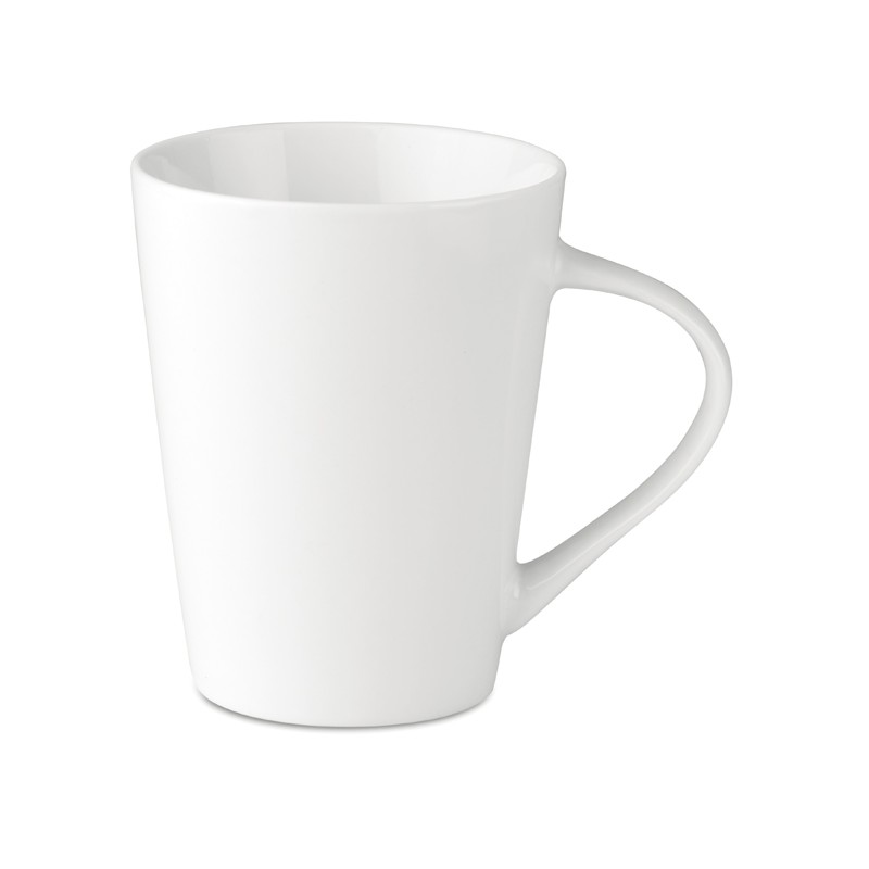 Tazze coniche in porcellana da 250ml. Il transfer su ceramica è resistente al lavaggio in lavastovglie, quella in tampografia no.