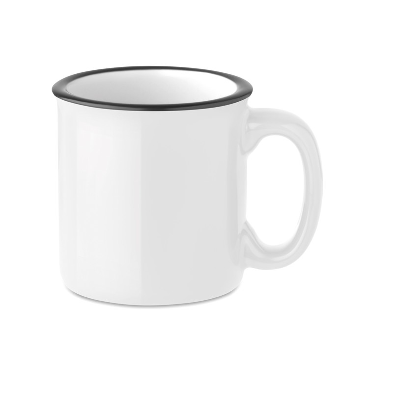 Tazze vintage in ceramica da 240 ml con rivestimento speciale per sublimazione. In scatola di cartone bianca.