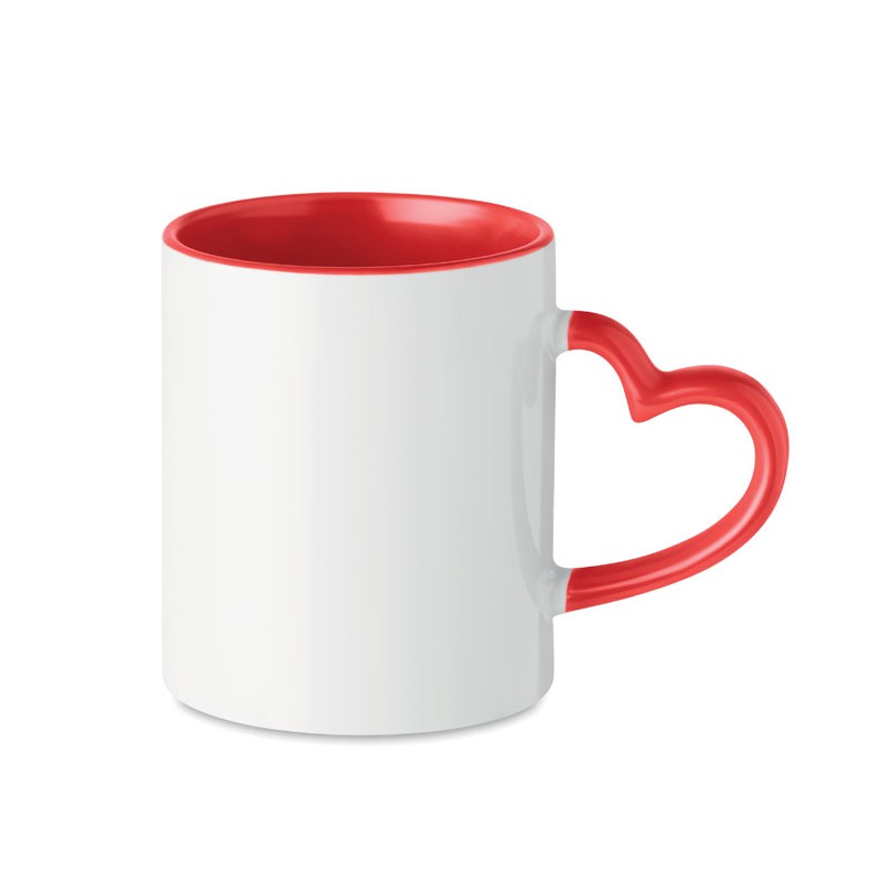 Tazze in ceramica da 300 ml con manico a forma di cuore e rivestimento speciale per sublimazione. In scatola di cartone bianca.