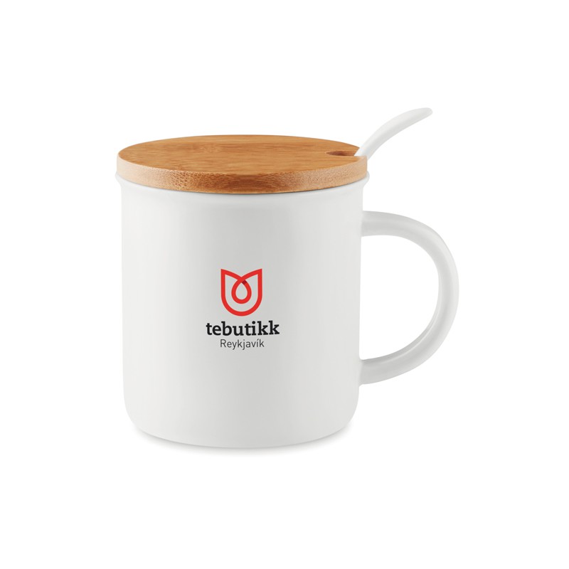 Tazze realizzate in porcellana con cucchiaino e coperchio in bamboo. Capacità 380ml. Confezionate singolarmente. La tampografia non resiste al lavaggio in lavastoviglie, il transfer su ceramica si.