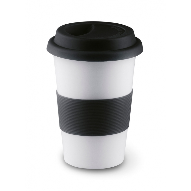 Tazza in ceramica (400 ml.) con tappo e fascia avvolgente in silicone. Non utilizzabile in forno a micro onde. Tutti i prodotti sono di ceramica